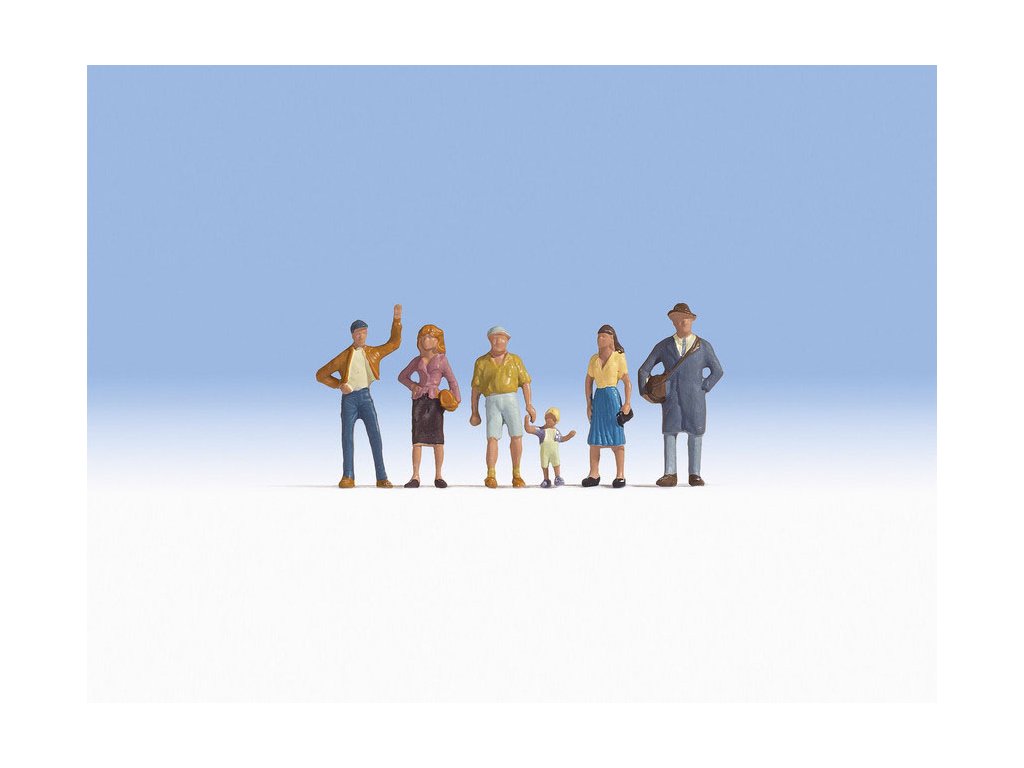 Mladý muž v džínách a kožené bundě mává; podnikatelka v business střihu s taškou pod paží se dívá před sebe. Dědeček v krátkých kalhotách a košili s krátkým rukávem drží za ruku své vnouče. Mladá žena v modré skládané sukni a žluté halence stojí a dívá se. Vysoký muž v šedém trenčkotu a klobouku čeká. Tato sada je ideální pro zdobení městských nebo vesnických scén na modelových kolejích. Figurky modelů jsou vhodné zejména pro návrh nástupišť a autobusových zastávek.