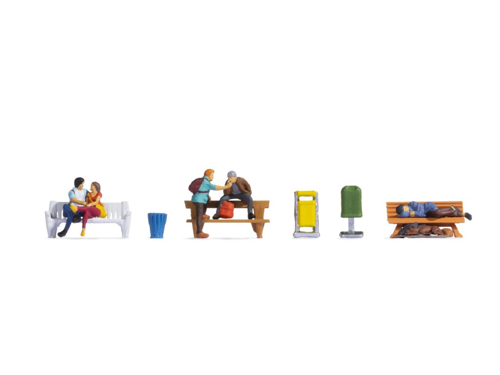 Pár sedí společně na jedné lavičce, zatímco dva mladí muži si povídají opodál. Zatímco muž s kloboukem sedí na opěradle lavice s batohem před sebou, druhý si o lavičku opírá nohu a má na sobě batoh. Součástí sady je i bezdomovec spící na lavičce. Veškerý jeho majetek je na dece pod lavicí. Jeho pes zde také našel své místo. Bohužel je i dnes mnoho lidí bez domova postiženo, a proto musí žít na ulici. Díky modelovým figurkám od NOCH nyní můžete tento aspekt reality znovu vytvořit v modelu a zobrazit všechny jeho aspekty na svém layoutu.