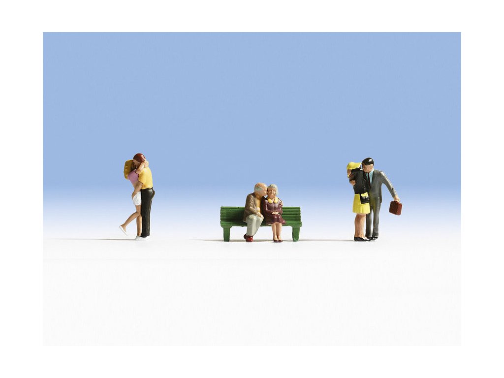 Sada obsahuje šest okouzlujících figurek modelových vlaků pro rozchod H0 (měřítko 1:87, výška cca 2 cm) a zelenou lavičku. Šest figurek představuje tři milenecké páry: Mladý pár stojí a líbá se těsně vedle sebe, pár středního věku si dává letmý polibek na rozloučenou před odchodem do práce a nakonec starší pár sedí uvolněně na zelené lavičce v parku a užívá si zaslouženého důchodu. Tři líbající se páry vyprávějí nádherný příběh lásky v různých fázích života a jsou ideální pro romantické scény na modelových kolejích a diorámatech.