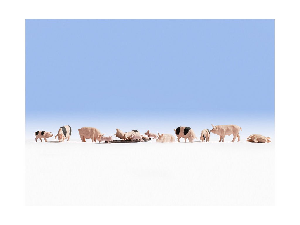 Sada obsahuje devět prasat a tři selátka pro měřítko H0 (měřítko 1:87, výška cca 2 cm).