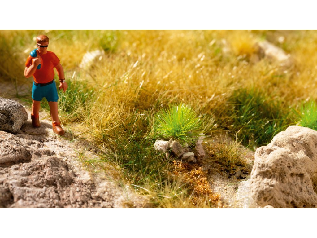 Trsy trávy NOCH PROFI jsou obzvláště realistické díky použití různých travních vláken, kamenů, steliva a stáda. To umožňuje vytvářet speciální chomáče pro velmi speciální aplikace. Všívačky PROFI jsou vhodné pro návrh modelových kolejišť a krajiny, ale jsou také ideální pro modeláře, kteří chtějí ozdobit dioráma nebo základnu modelu. PROFI trsy na trávu "Dry Grass" jsou vhodné zejména pro úpravu letních luk a lesů, stejně jako náročných krajnic silnic a kopcovitých krajin.