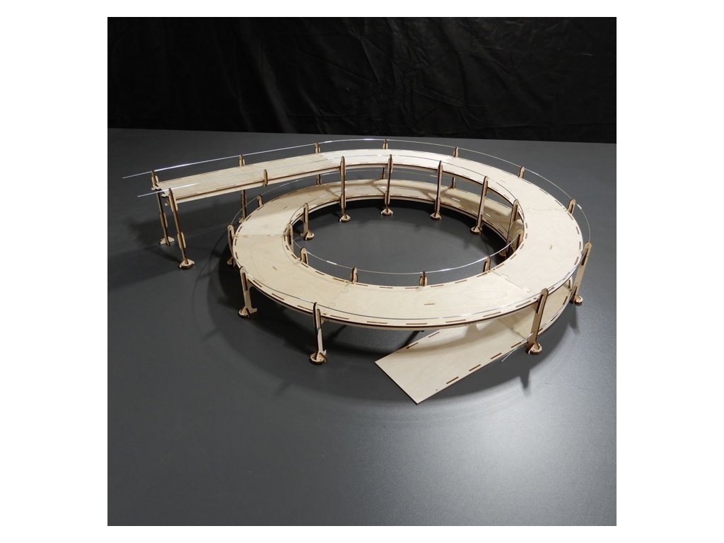 RONDELA je určena pro nájezdy a výjezdy do skrytého nádraží a velkou změnu výšky tratě ve spirálovém stoupání. Každá Rondela může být sestavena s levotočivým nebo pravotočivým stoupáním. Pro stavbu jsou použity obloukové segmenty I-Track. Jsou vyrobeny z kvalitní překližky. Mají různé poloměry a jsou navrženy pro jednoklejné a dvojkolejné tratě. Setavují se za sebou do potřebného tvaru. Nemusíte tedy nic řezat ani brousit – pouze sestavujete segmenty do požadovaného tvaru. Pokud potřebujete vystoupat nahoru na malém prostoru, můžete klidně stavět několik pater Rondely nad sebou, počet pater není limitován. Doporučená maximální výška stoupání jsou 4%. Výška stoupání je dána dodávanými sloupky. Základní rozteč sloupků je 30° na oblouku. Pokud potřebujete změnit úhel stoupání, jednoduše posunete sloupky tak, aby vyhovovaly vaší potřebě. Při zvětšení vzdálenosti mezi sloupky se úhel stoupání snižuje. Při zkrácení vzdálenosti (úhlu) mezi sloupky se úhel stoupání zvětšuje – Pozor na dodržení doporučeného maximálního stoupání! Spirálová trať - Rondela se staví na standartní Základní desce nebo na Základní dece Rondela. Tato deska má konstrukci navrženou tak, aby navazovala plynule na skryté nádraží.