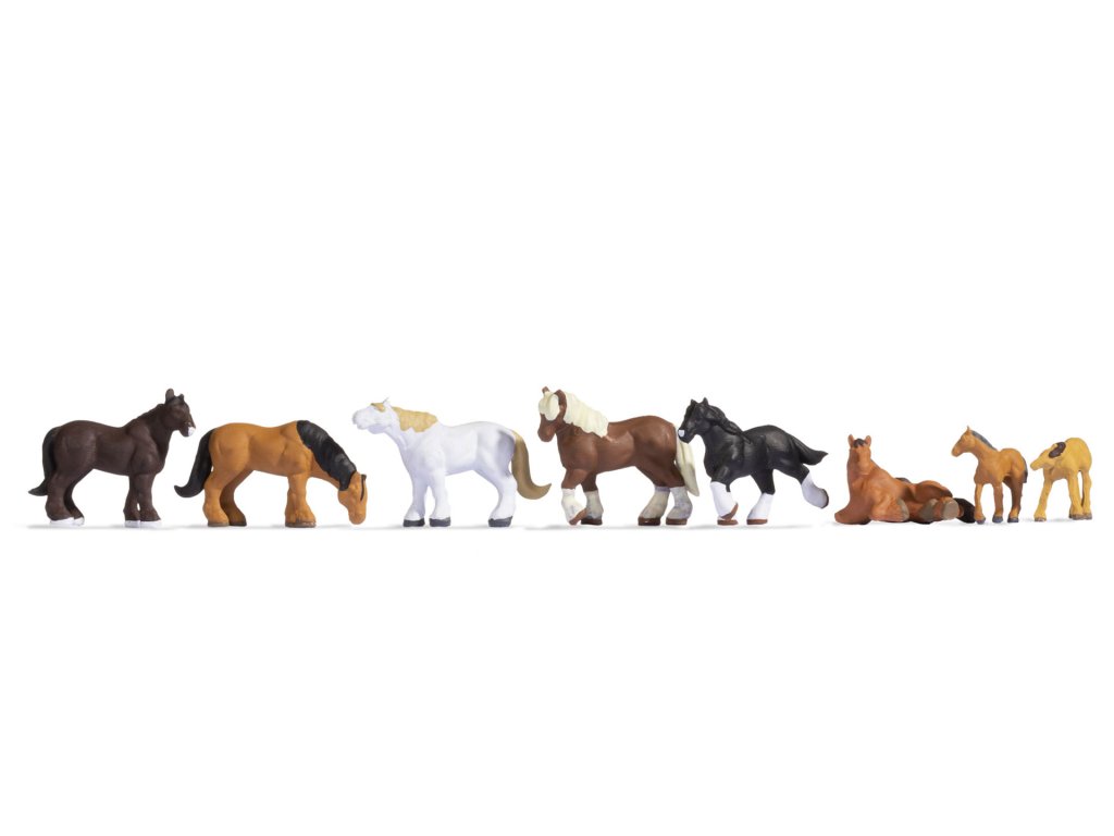 S figurkami „Tažní koně“ si můžete úspěšně vyzdobit detailní a realistické venkovské scény. Sada obsahuje osm figurek pro měřítko H0. Dvě hříbata šťastně objevují svět, zatímco jeden z vzrostlých tažných koní leží v trávě a ostatní se pilně živí pastvou pro srdce nebo si užívají krásného letního dne na pastvině.