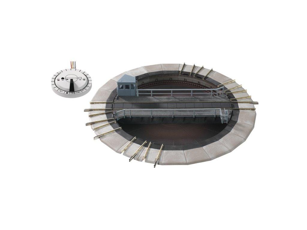 Modelová točna s elektropohonem a individuálně přepínatelnými výjezdy z kolejí, s ovladačem ( FL 6910 ). Délka otočného mostu 183 mm. Vhodné pro kolejnice H0 PROFI a další kolejnicové systémy H0.