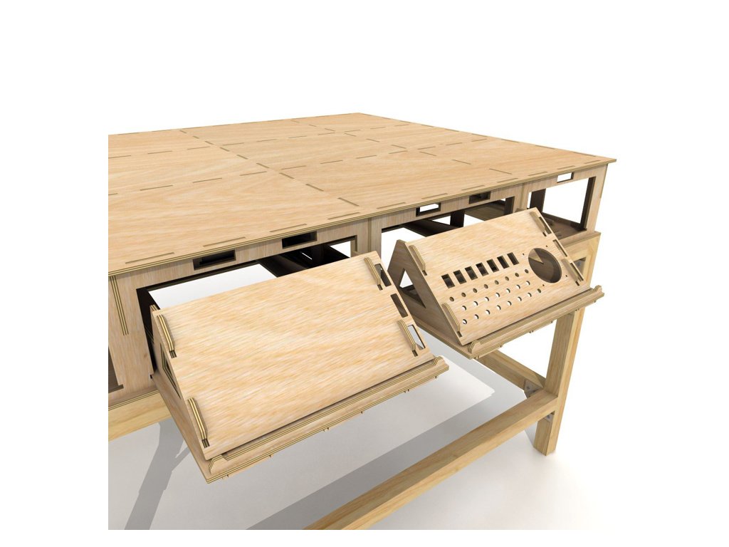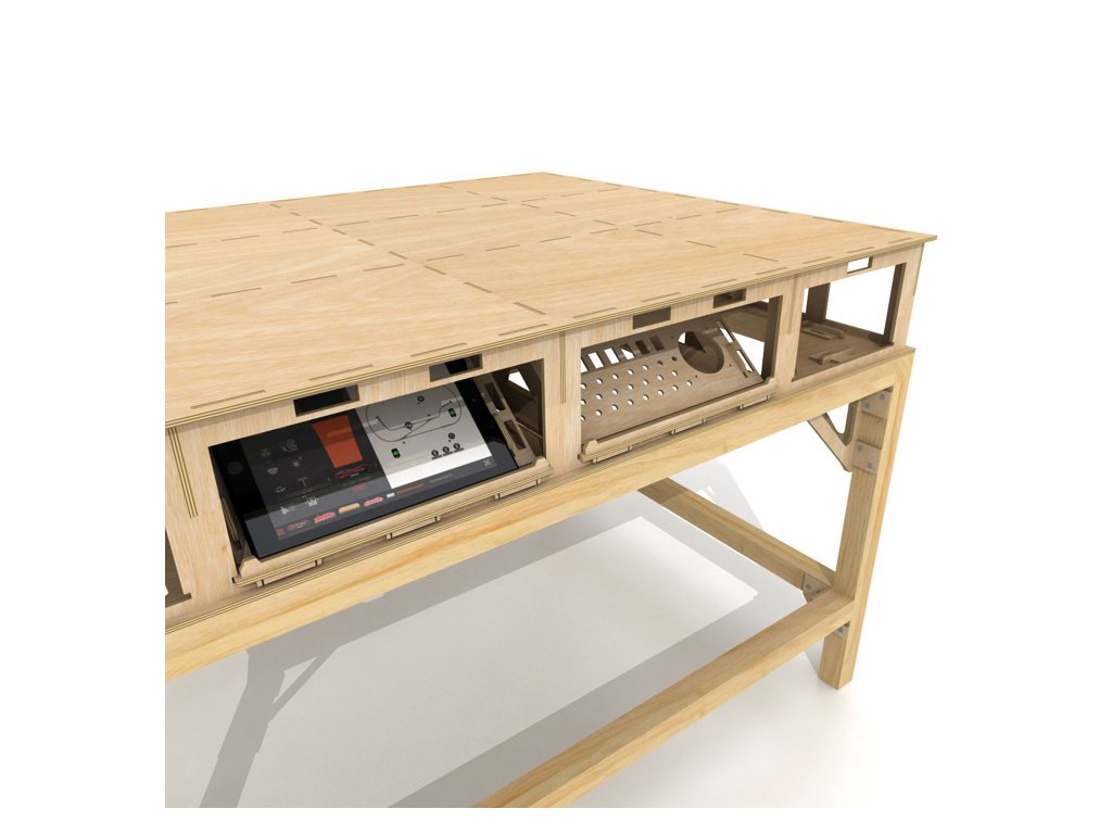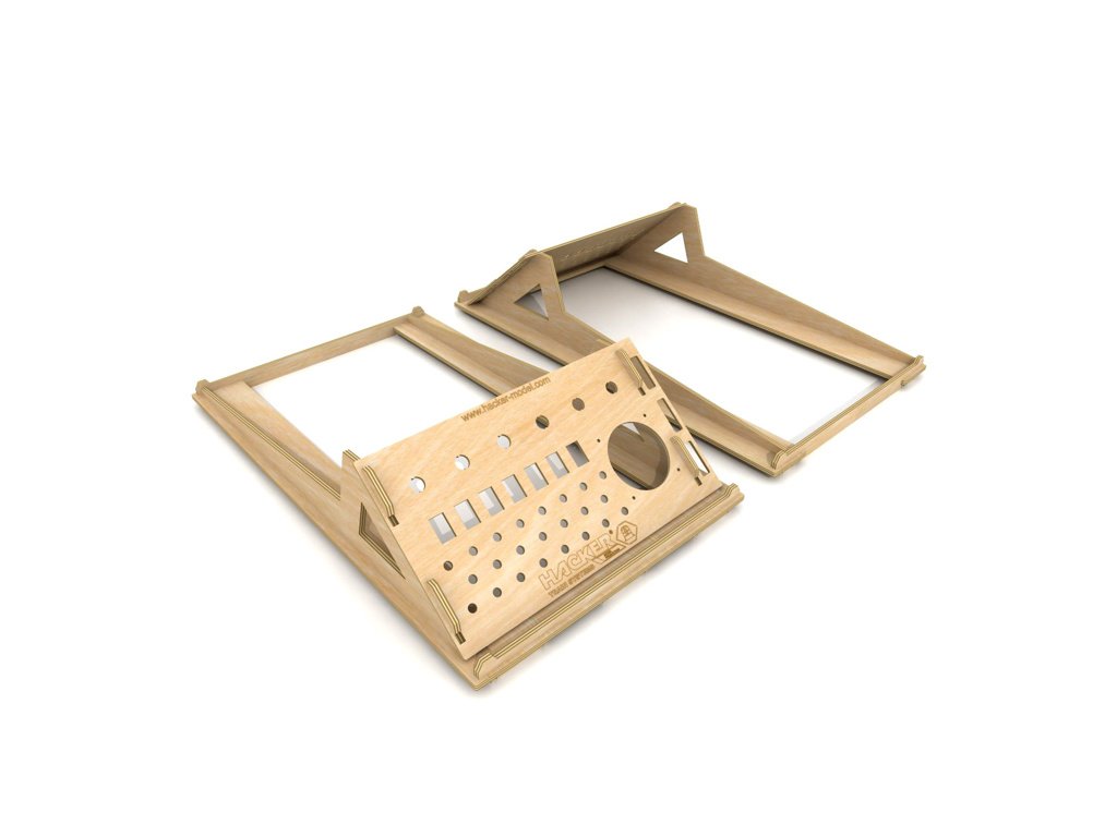 Celý výsuvný držák setavíte, bočnice přilepíte a potom ho zasunete do drážek v základní desce (100x80, 10x90, 120x80, 120x90, 120x100). Zacvaknete zadní spojku a nasadíte přední panel. Na ten můžete položit tablet ( max.12“) pro ovládání kolejiště. Na dalším držáku můžete umístit panel pro potřebné ovladače – tlačítka, přepínače atd. Celý držák je zasunutý v základní desce. Pro provoz ho jednoduše vytáhnete ven a můžete jezdit. Po skončení zasunete zpět do desky, aby „nepřekážel“ a neprášilo se na něj. Přední desku lze jednoduše vyndat, aby bylo možné instalovat vše potřebné. Potom jí jednoduše nasadíte na výsuvný držák. Pokud potřebujete speciální otvory, lze je vytvořit do panelu pod tablet.