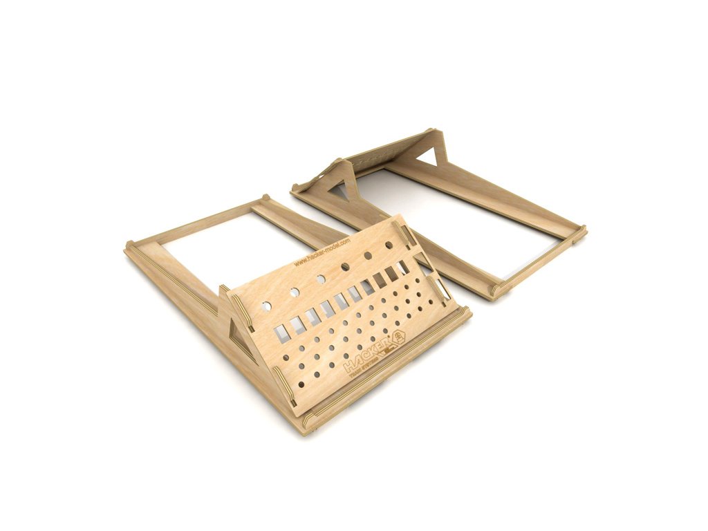 Celý výsuvný držák setavíte, bočnice přilepíte a potom ho zasunete do drážek v základní desce (100x80, 10x90, 120x80, 120x90, 120x100). Zacvaknete zadní spojku a nasadíte přední panel. Na ten můžete položit tablet ( max.12“) pro ovládání kolejiště. Na dalším držáku můžete umístit panel pro potřebné ovladače – tlačítka, přepínače atd. Celý držák je zasunutý v základní desce. Pro provoz ho jednoduše vytáhnete ven a můžete jezdit. Po skončení zasunete zpět do desky, aby „nepřekážel“ a neprášilo se na něj. Přední desku lze jednoduše vyndat, aby bylo možné instalovat vše potřebné. Potom jí jednoduše nasadíte na výsuvný držák. Pokud potřebujete speciální otvory, lze je vytvořit do panelu pod tablet.
