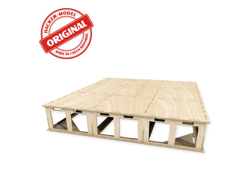 Základní deska pro stavbu kolejiště. Deska má speciální konstrukci, která zaručuje tuhost a velmi nízkou hmotnost. Vyztužovací příčníky mají u horní strany otvory, které lze použít pro instalci kabelů. Otvory ve spodní desce zajistí přístup do všech míst. V případě potřeby je lze zakrýt dodanými deskami a využít jako odkládací prostory. Desky lze poskládat na požadovaný rozměr. Originál Hacker Desky se připevňují přímo na Originál základní rám vyrobený z hoblovaných latí latí. Rám je vhodné dole opatřit otočnými kolečky. S celou konstrukcí lze lehce pohybovat do všech stran a "ušetříte" tak místo. Nemusíte mít uličku kolem celého kolejiště. Dodává se v rozloženém stavu. Sestavení je jednoduché. Vše do sebe zapadá na zámky. Lepí se lepidlem na dřevo (Herkules apod.)