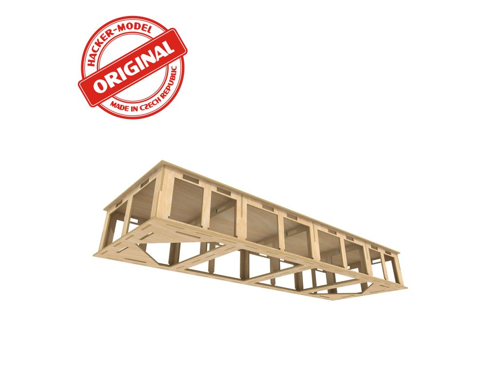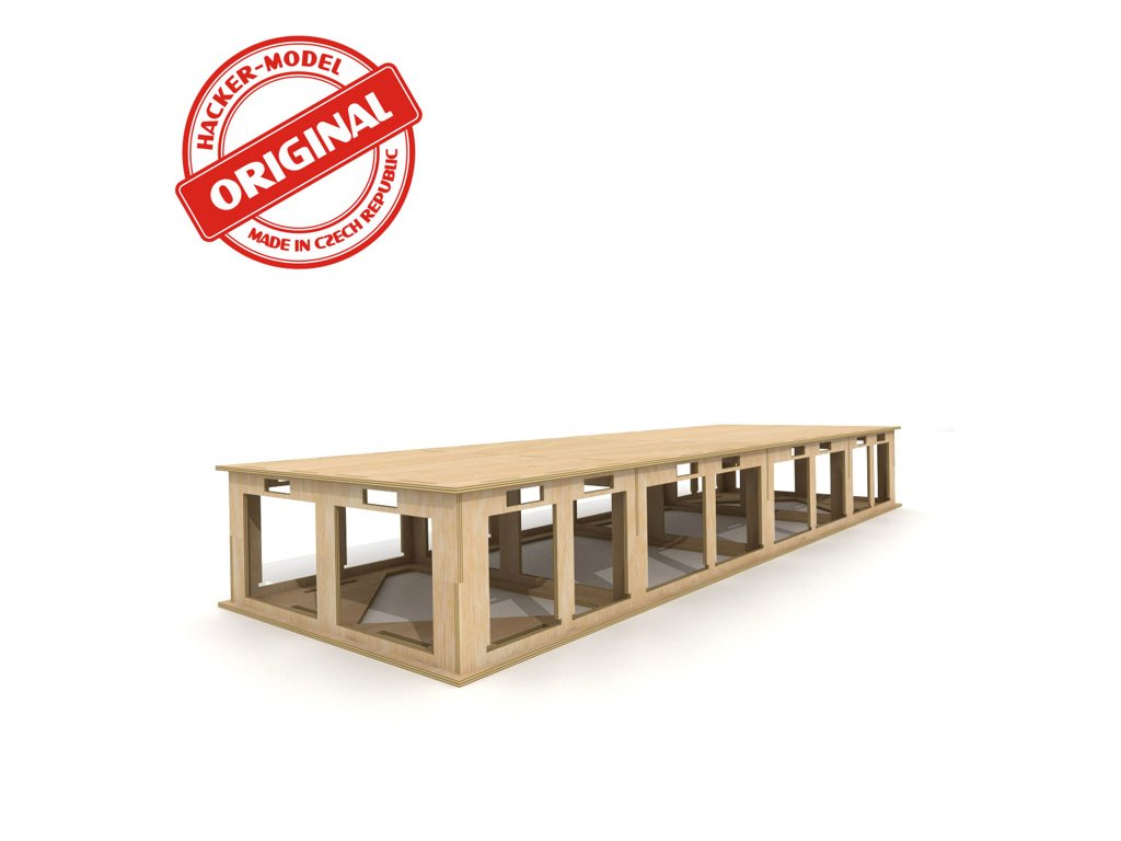 Základní deska pro stavbu kolejiště. Deska má speciální konstrukci, která zaručuje tuhost a velmi nízkou hmotnost. Vyztužovací příčníky mají u horní strany otvory, které lze použít pro instalci kabelů. Otvory ve spodní desce zajistí přístup do všech míst. V případě potřeby je lze zakrýt deskami a využít jako odkládací prostory. Desky lze poskládat na požadovaný rozměr. Originální desky se připevňují přímo na Originál Hacker základní rám vyrobený z hoblovaných latí. Rám je vhodné dole opatřit otočnými kolečky (není součástí dodávky). S celou konstrukcí lze lehce pohybovat do všech stran a "ušetříte" tak místo. Nemusíte mít uličku kolem celého kolejiště. Dodává se v rozloženém stavu. Sestavení je jednoduché. Vše do sebe zapadá na zámky. Lepí se lepidlem na dřevo (Herkules apod.)