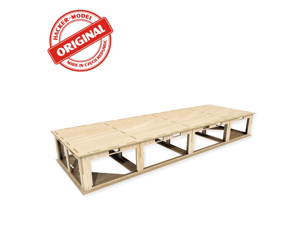 Základní deska pro stavbu kolejiště. Deska má speciální konstrukci, která zaručuje tuhost a velmi nízkou hmotnost. Vyztužovací příčníky mají u horní strany otvory, které lze použít pro instalci kabelů. Otvory ve spodní desce zajistí přístup do všech míst. V případě potřeby je lze zakrýt deskami a využít jako odkládací prostory. Desky lze poskládat na požadovaný rozměr. Originální desky se připevňují přímo na Originál Hacker základní rám vyrobený z hoblovaných latí. Rám je vhodné dole opatřit otočnými kolečky (není součástí dodávky). S celou konstrukcí lze lehce pohybovat do všech stran a "ušetříte" tak místo. Nemusíte mít uličku kolem celého kolejiště. Dodává se v rozloženém stavu. Sestavení je jednoduché. Vše do sebe zapadá na zámky. Lepí se lepidlem na dřevo (Herkules apod.)